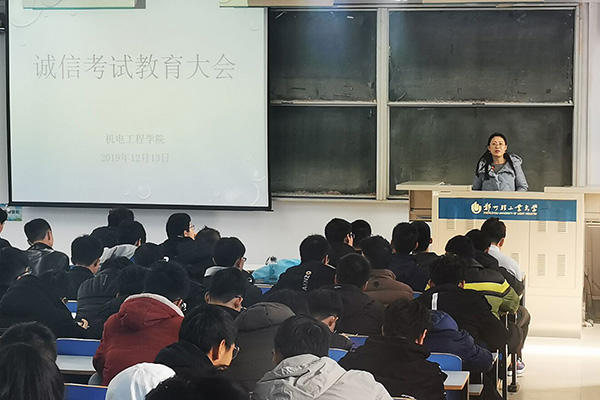 为端正学习风气,营造良好考风,2019年12月13日中午,机电工程学院党总支副书记孙琳在东一楼200教室为2019级学生召开诚信考试教育大会。