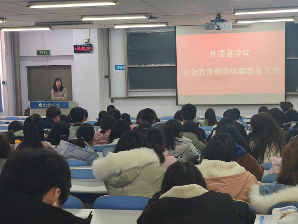 为进一步加强学生安全教育与引导工作,引导学生提高防诈骗意识,1月3日,外国语学院在教三楼104教室召开安全教育暨防诈骗教育大会。
