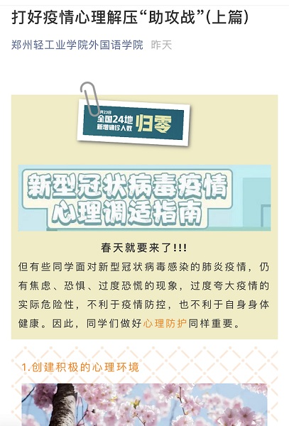 会上,王老师向各位成员了解了学生反映的问题,对大家的工作表示了肯定。她强调,特殊时期要尤其重视同学们的心理状态,作为心理工作学生干部,更要积极主动联系心理委员,了解同学们的需求,帮助同学们保持良好的心态。随后,王老师对下一步学院心理工作作出了安排和指导,鼓励同学们再接再厉,继续将心理工作落到实处,帮助到有需要的同学。会后,根据会议精神,我院于2月25日在学院公众号推送相关心理健康推文,进一步做好了心理健康宣传。