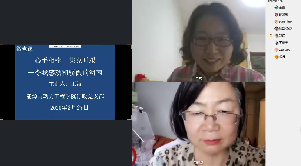 能源与动力工程学院行政党支部会由支部书记吴学红主持,王霄同志上了一堂题为《心手相牵共克时艰——令我感动和骄傲的河南》的微党课。学院党委书记邵建敏同志传达了《18新利直播