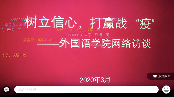 防疫工作已经到了关键时刻,在科学做好新型冠状病毒肺炎疫情工作的基础上,为保证学生网课学习有序开展,外国语学院3月3日晚召开了网络访谈活动。