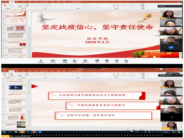政法学院高度重视学生思想政治教育工作,充分发挥思政课在抗击疫情中的教育引领作用。通过本次理论宣讲,进一步引导学生坚定信念、同舟共济、共克时艰,勇担时代赋予的使命与责任,与祖国同命运,与人民共患难,为全力打赢疫情防控阻击战、总体战提供坚强的思想保证和精神动力。
