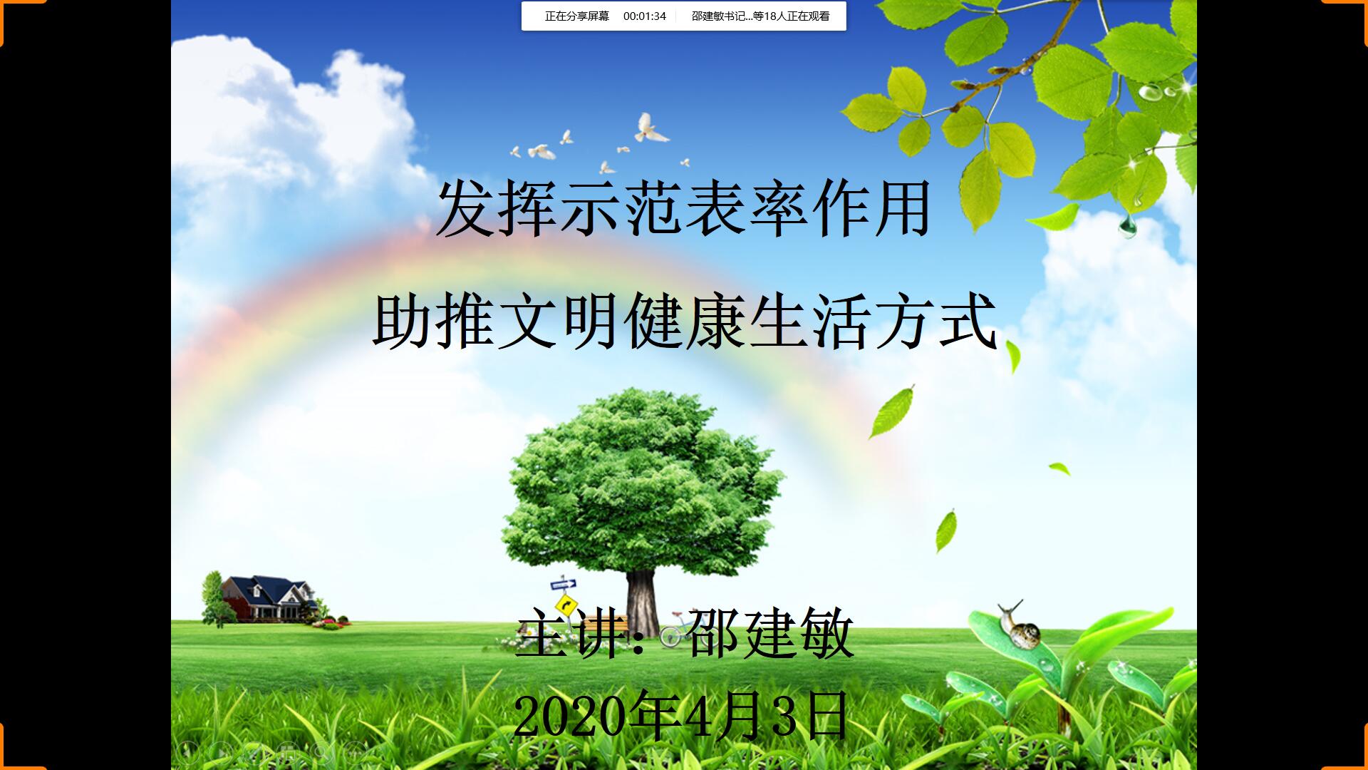 4月3日下午3点,能源与动力工程学院党委书记邵建敏通过QQ视频会议上了一堂题为“发挥示范表率作用,助推文明健康生活方式”的主题党课,学院全体班子成员、各支部委员和科室负责人参加了党课学习。
