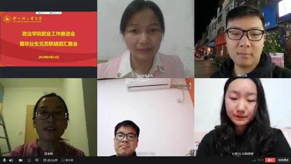 会上,匡竞老师讲解了毕业生就业工作中的各项注意事项,介绍了学校就业指导中心的“网上云签约”和“网上签约”系统的操作指南。全体毕业生党员依次介绍了本人负责帮扶同学工作进展情况和遇到的困难。毕业生党员充分了解了本组同学的就业需求情况,为其提供招聘信息,了解其存在的实际困难并积极帮助解决。大家就毕业生反映的海投简历回复少、疫情期间面试不便等问题进行了沟通交流。刘放美副书记对各工作组工作汇报情况进行了点评,对志愿报名西部计划的同学进行了具体指导,充分肯定了毕业生党员的精准就业服务,鼓励毕业生树立信心,多渠道收集招聘信息,以点带面助力就业。
