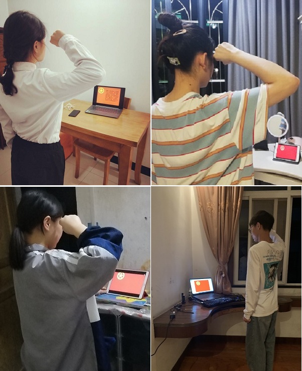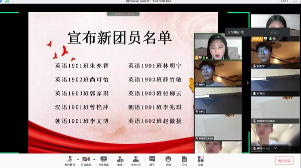 仪式伊始,气势磅礴的国歌声,激起了大家心中的自豪感与责任感。主持人宣读2020年新入团团员名单,朝鲜语1801班团支部书记张坤进行领誓,新团员集体举行庄严的入团宣誓,大家举起右手,面向团旗,庄严宣誓,神圣而庄重。宣誓完毕,新老团员线上学习《团章》中有关团员义务和权利条款,并分别进行线上发言。