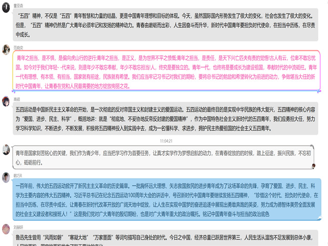 各班级团支部依托网络平台集中开展“五四精神·传承有我”主题团日活动、五四观影活动等线上活动,掀起了继承和发扬五四精神的热潮。通过活动的开展,进一步激励和引领广大团员青年时刻牢记习近平总书记嘱托,坚定理想信念,练就过硬本领,为决胜全面建成小康社会、实现中华民族伟大复兴中国梦贡献青春力量。