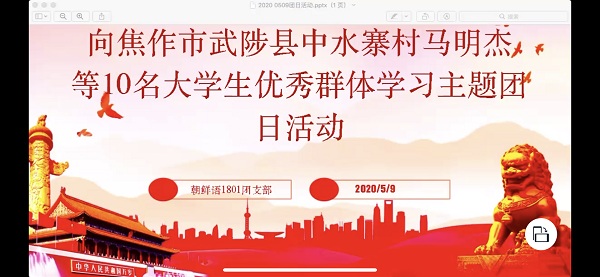 焦作市武陟县中水寨村马明杰等10名大学生,在2020年初新冠肺炎疫情防控斗争中,积极响应习近平总书记和党中央号召,利用寒假返乡之际,主动报名、投身所在乡村的疫情防控和脱贫攻坚工作,以自己所学知识和实际行动回报家乡父老。他们参与村防控监测点执勤、巡街宣传和村内消杀等工作,筑牢疫情防控的坚固防线,为维护人民身体健康和生命安全作出了贡献,被所在乡党委、政府称为“防疫尖兵”。在疫情形势稍有缓解之后,他们主动帮助企业和群众复工复产,协助村民春耕备耕,灌溉农田,栽种果树,尽己所能促进本村经济社会发展。他们走访慰问村里贫困户,发挥自身专业优势为贫困户家庭的中小学生辅导功课,还通过直播方式进行网络授课,受到学生们的欢迎,得到了村民的充分肯定和高度赞扬。各团支部负责人领学了他们的先进事迹,并与正在开展的“把灾难当教材、与祖国共成长”主题教育有机结合起来,引导团员积极讨论,发表感想,化为行动。
