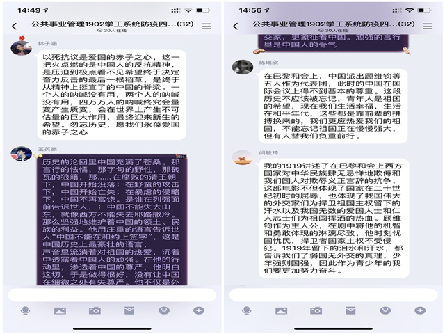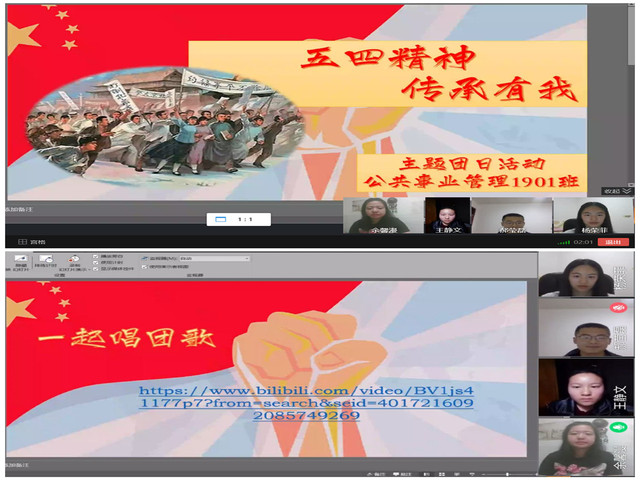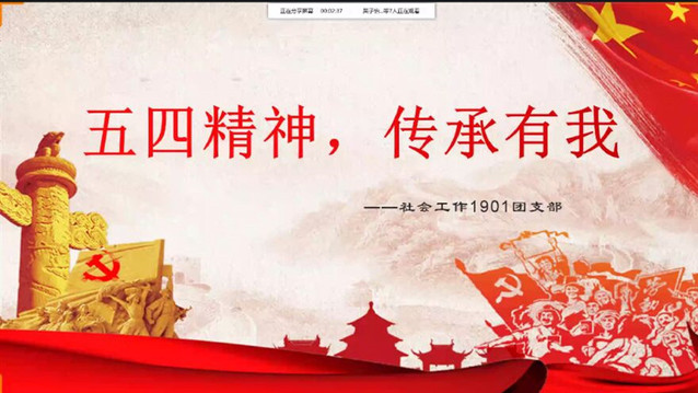 各班级团支部紧扣主题,采取丰富多彩的活动形式,传承和发扬五四精神。公共管理1901团支部主题团日活动在“光荣啊!中国共青团”的歌声中拉开序幕,在团支书的领誓下,大家重温入团誓词,进行线上宣誓,感受当年宣誓的热情,并在线观看“团的光辉历史”视频,同学们在班级群里积极互动、发表感想。公共管理1902班团支部共同观看了影片《我的1919》,同学们围绕影片,积极抒发感悟,表达了深厚的爱国之情和为祖国贡献青春的决心。法学1902团支部开展了“五四知识问答”活动,并踊跃参与了“我们都是收信人”活动,在小程序中“放飞梦想”,实现了五四精神的接力和传承。法学1901团支书带领大家回顾薪火相传、历久弥新的五四精神,鼓励大家传承与发扬五四精神,并号召团员青年在抗击疫情的特殊时期,更要在担当中历练,在尽责中成长,发挥青年力量,实现青春梦想。