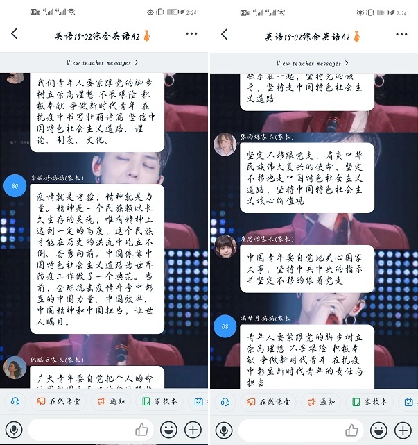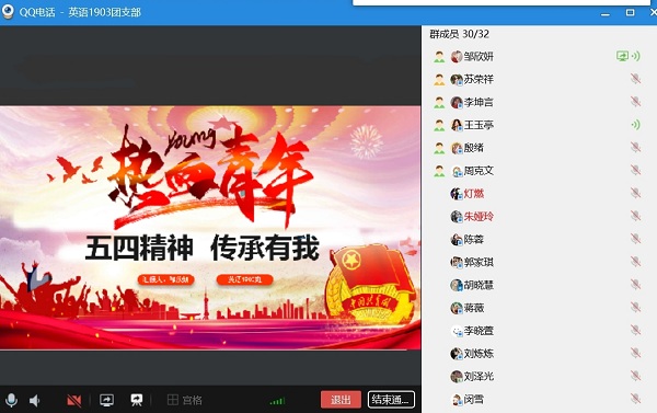 活动在庄严的国歌声中正式拉开序幕。各团支部成员相会云端,热议时代热点,思考青年责任与担当,以别出心裁的创意、新颖有趣的形式,传承与践行“五四”精神。团支书带领学生们重温了《习近平给在首钢医院实习的西藏大学医学院学生的回信》《习近平给北京大学援鄂医疗队全体“90后”党员的回信》以及习近平总书记在2020年五四青年节对广大青年的寄语等重要内容。广大团员青年围绕新时代的青年如何传承五四精神、用奋斗铸就最美青春等话题,在云端上展开深入讨论。英语1903班团支部邹欣妍认为,作为新时期的“后浪”,我们一定要保持奋斗的姿态,追逐奋斗的李想,以青春之我在新时代勇立潮头、锻炼本领,把青春融入到实现中华民族伟大复兴的奋斗中,镌刻在建功强国伟业的历史丰碑上。