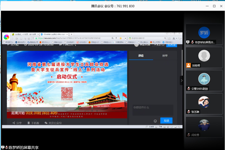 5月26日上午,政法学院组织收看河南省第七届退役大学生士兵就业双选暨大学生征兵宣传“线上”系列活动启动仪式,学院党委副书记刘放美、毕业班辅导员及全体毕业生参加。