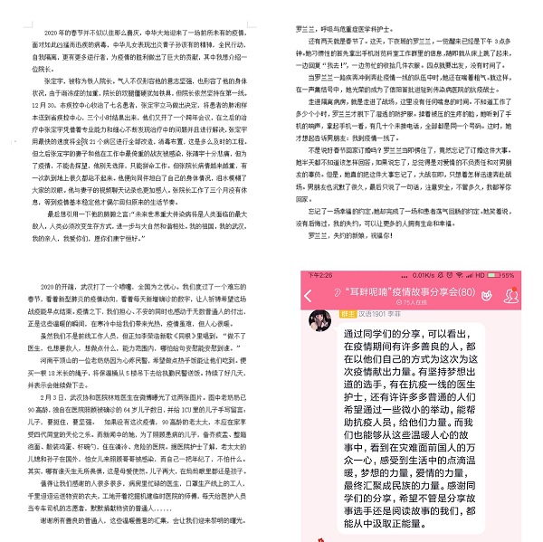 活动以疫情期间暖心故事分享为主题组织同学们搜集并分享交流抗疫期间涌现出的无私奉献不畏艰险忠于职守的正面事迹与积极作为,活动中同学们积极参与、踊跃发言,从不同角度阐述了疫情下那些温暖人心的动人时刻,在交流体会中更加深入地感受到危难时刻挺身而出的可贵品质,进一步增强同学们发现并感悟平凡生活中点滴温暖的能力,弘扬主旋律,传递正能量。