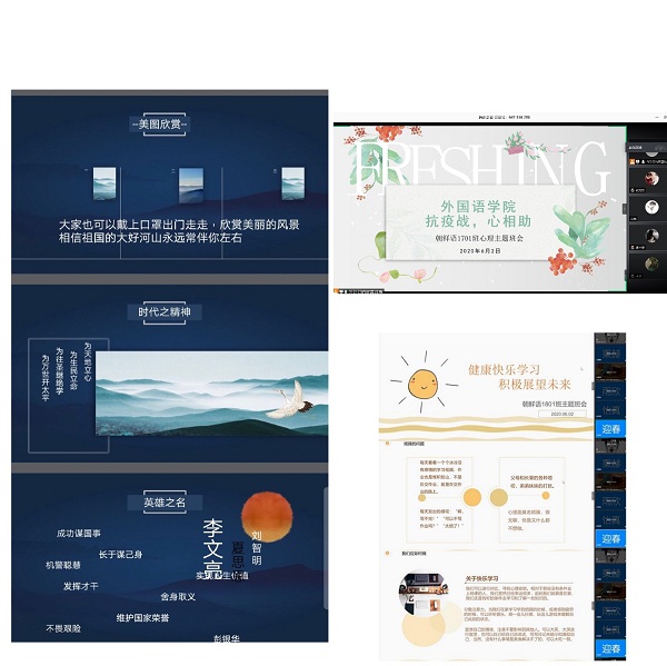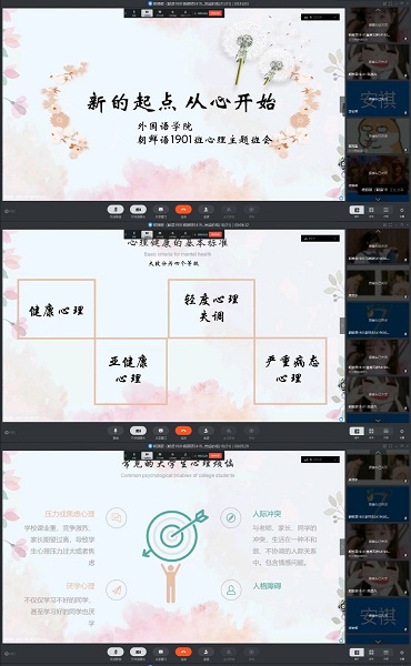 本次主题系列班会以借助钉钉、腾讯会议、qq等多种平台,主题丰富多样,参与人数众多。朝鲜语19-01班从当代大学生常见烦恼为切入点,向同学们介绍了“健康心理”、“亚健康心理”、“轻度心理失调”和“严重病态心理”等概念,并为大家提供解决问题释放压力的多种方法。朝鲜语18-01班着眼快乐学习,分享健康快乐学习方法,共同展望美好未来,提高了同学们居家学习的积极性。英语19-01班带领同学们再次学习抗疫过程中的英雄精神,强化心理素质,坚定胜利信心,从而引导同学们积极调整心态,促进心理健康。