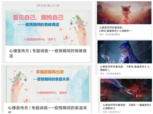 宣传月期间,心理健康教育中心专职教师结合学生近期的心理需求和兴趣分别开展了题为《看见自己,拥抱自己——疫情期间的情绪调适》 、《幸福家庭再出发--疫情期间的家庭关系》、《心理老师带你看电影:〈哪吒——魔童降世〉心理解析》的专题讲座,先后通过线上直播和微信公众号回放的方式推出,累计观看师生千余人。讲座内容贴近生活,既有理论讲解又有现场体验,引导学生自我认识与探索,合理纾解不良情绪,理解和处理好家庭关系,培育积极向上的健康心态。
