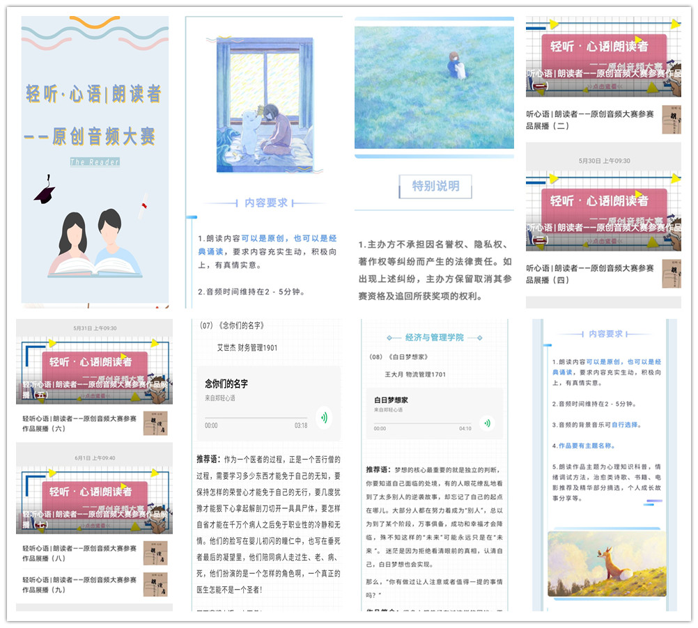 为鼓励同学们挖掘书香与文字的力量和美,用最动听、纯净、治愈的声音,描绘书香美景,传递情绪情感,安抚与陪伴心灵,从而培育积极向上、阳光乐观的健康心态,我院举办“轻听·心语——朗读者”蒲公英心理素质提升项目活动。本次活动以“疫”心相助,携手成长为主题面向我院全体在校生展开。