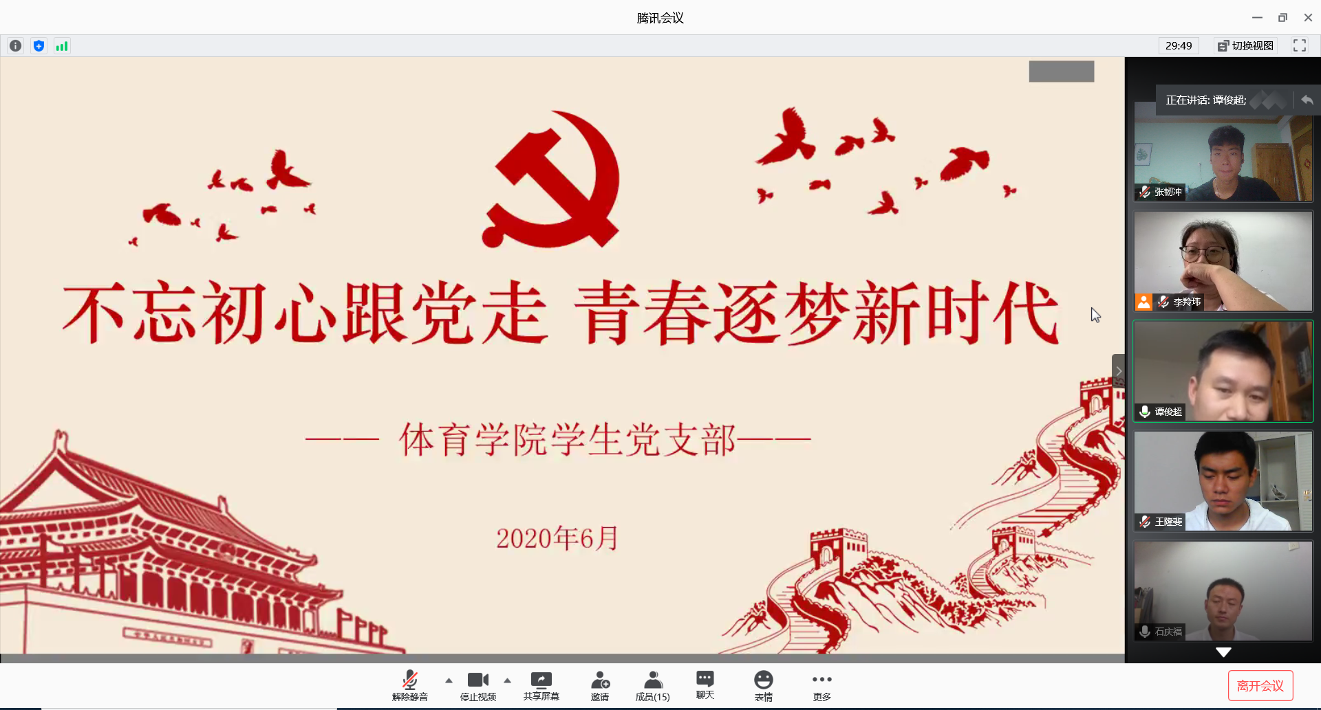 为扎实开展毕业生党性教育、强化毕业生党员意识,体育学院学生党支部于6月16日组织开展了毕业生党员“最后一次党课”活动。学院党总支副书记谭俊超老师以《不忘初心跟党走,青春逐梦新时代》为主题,为全体毕业生党员上了一堂难忘的党课。