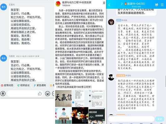 为扎实做好特殊时期学生的诚信考试教育和人生安全教育,提高学生的诚信意识和安全意识。能源与动力工程学院近期通过“云班会”陆续召开了考试诚信暨安全教育大会。辅导员组织2017级、2018级、2019级全体同学参加了此次主题班会。