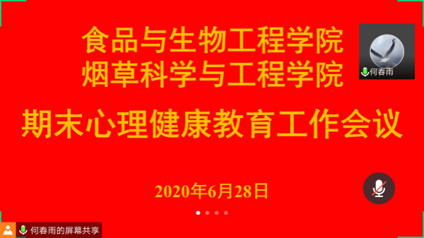 6月28日晚,食品与生物工程学院在腾讯会议召开期末心理健康教育工作总结会议。学院心理健康教育专职辅导员何春雨老师、各班级心理委员和学生会心理部全体成员参加了此次会议。