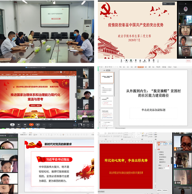 法学系党支部书记张威以《牢记初心使命、争当出彩先锋》为题,带领支部全体党员一起重温了党的历史,探讨法学教师在国家法治建设中如何更好的贡献科技力量,争当出彩先锋。社会工作系党支部书记徐京波以《从外源到内生:“脱贫摘帽”贫困村的社区能力建设路径》为题,分别从脱贫内生动力相关研究、“脱贫摘帽”贫困村社区能力不足的表现形式、社区能力建设路径三个方面讲述了在脱贫攻坚战中,如何形成统一的社区价值取向,构建凝聚力强的“社会生活共同体”,从而对脱贫成果有效承接。公管社保与实验中心联合党支部书记郝宏杰以《推进国家治理体系和治理能力现代化重温与思考》为题,讲述了新时期国家治理体系和治理能力现代化建设的要求,探讨作为公共管理学科的教师,在推进国家治理体系和治理能力现代化这一重大战略任务中应该承担的责任和使命。其他党支部也分别从疫情防控中的中国制度优势、立足岗位讲奉献、勇于担当比作为等方面开展了专题党课。