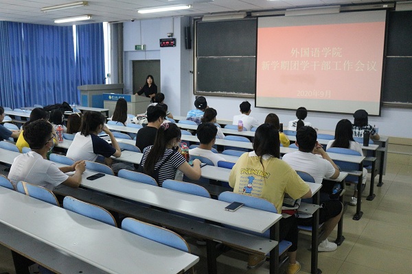 2020年9月8日13:00,外国语学院在教三楼104召开全体团学干部大会,学生会全体成员及各年级团干参加会议。会议由外国语学院团委书记矫菲主持。