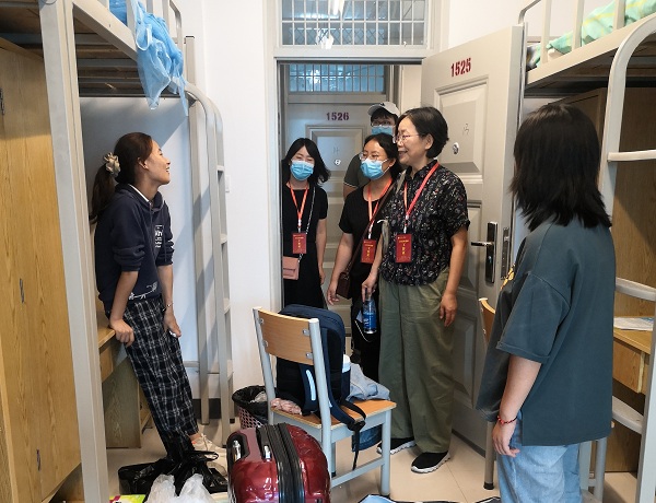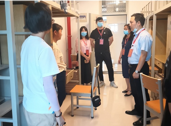 在宿舍走访中,领导老师们每走进一间学生宿舍,都与学生进行亲切交流。王伟书记仔细察看了新生宿舍各种设施,关切询问新生是否适应新的环境、住宿是否习惯等基本情况,希望新生们能够尽快转变角色,以适应大学里的新环境,尽快学会照顾自己并处理好同学之间的关系。在疫情防控方面,一定要提高防控意识,遵守学校管理规章制度。陈文凯院长希望同学们做一个详细规划,尽早确立学习目标和职业目标,把外国语学院当成自己的家,在学习生活中遇到困难要及时与辅导员、专业老师和班主任沟通交流,把问题及时解决。