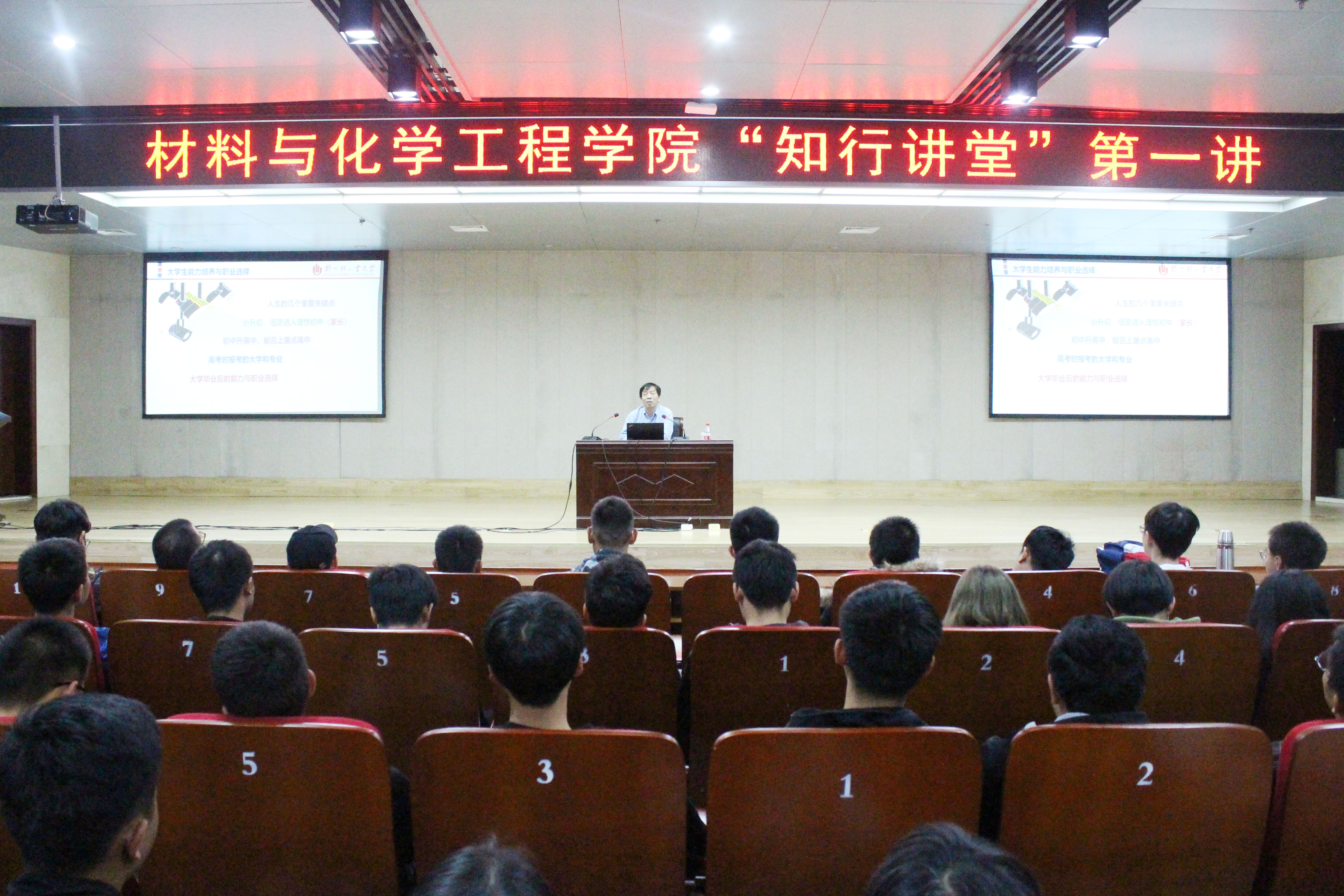 10月22日晚,材料与化学工程学院“知行讲堂”正式开讲。尹志刚教授应邀在图书馆一楼报告厅以“大学生能力培养与职业选择”为题作了首场报告,2020级全体学生、学院党委书记常亮、党委副书记司丽娜、辅导员老师聆听了报告。报告由司丽娜主持。