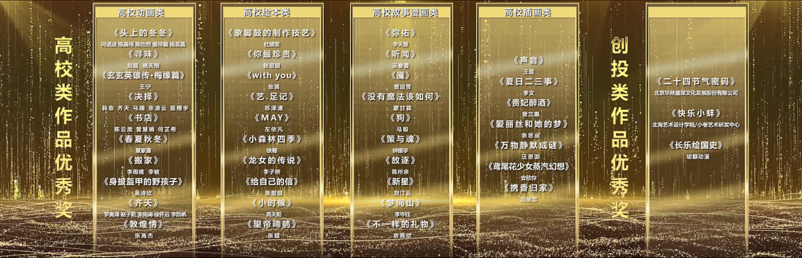 “金犀奖”原创动漫作品征集和评选是金犀奖·动漫节的重要活动板块。本届动漫节共收到来自98所高校、多家企业和艺术家的990件作品,细分为动画短片奖、故事漫画奖、学生绘本奖、学生插画奖,各类评选出1件金奖作品,3件银奖作品,5件铜奖作品,10件优秀作品,并在开幕式上为金奖和银奖作品举行了隆重的颁奖典礼。