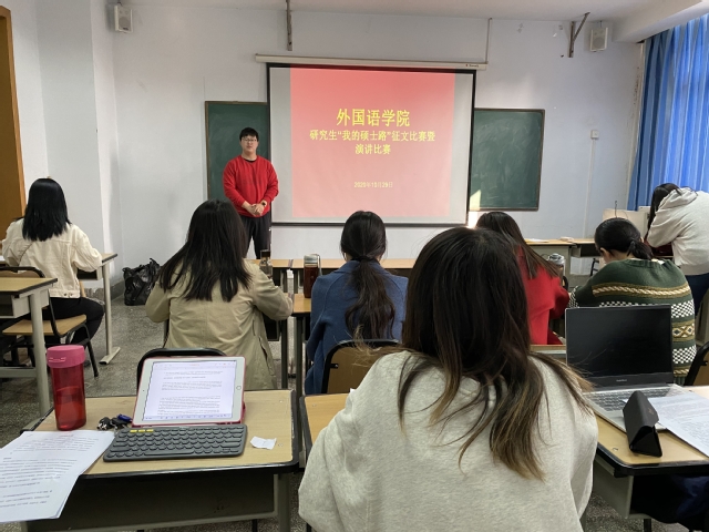 10月29日下午,外国语学院在东二楼409举办“我的硕士路”征文暨演讲比赛。本次活动由学院研究生辅导员李昱盛主持,2019级学生代表高莹、沈淑雅和2020级全体研究生参加了此次活动。