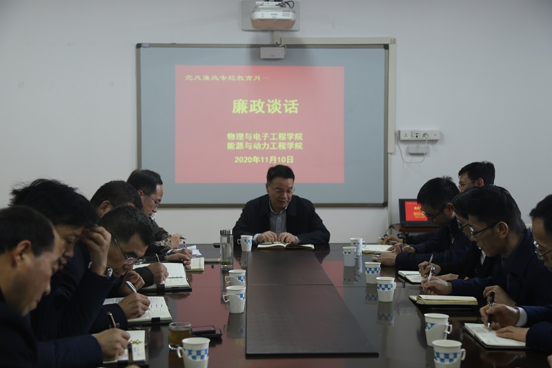 为贯彻全面从严治党要求,营造风清气正的校园环境,进一步提高干部廉洁自律意识,不断增强拒腐防变能力。11月10日,副校长刘新田开展了与联系学院干部集体廉政谈话。能源与动力工程学院、物理与电子工程学院全体班子成员参加了谈话。