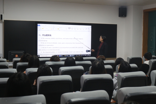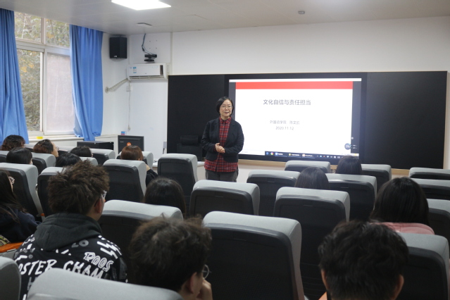 陈文凯院长围绕“文化自信与责任担当”的主题,首先以习近平总书记关于文化自信的重要讲话开场,用丰富的图文资料和生动的事例分别从“文化的定义”、“文化自信的内涵、由来及底气”、“增强文化自信的重要意义”、“如何增强责任与担当”等多方面层层递进,展开讲解。陈院长强调作为青年学子,特别是外国语学院的学生,更应该学习和传承好优秀传统文化,把优秀传统文化的元素和理念贯彻到自己的学习实践、日常行为中去。她殷殷嘱托:广大青年学子要坚定文化自信,将优秀传统文化和时代精神、社会实践紧密结合,学好知识、掌握好本领,为实现中华民族伟大复兴的中国梦而努力,争取讲好中国故事,传播好中国声音。