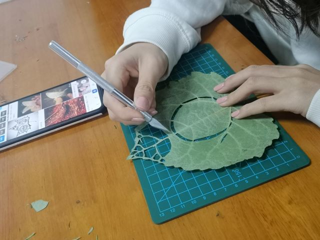 活动开始前经过部门全体成员商讨,最终确定下来叶雕这个传统工艺与现代相结合的方式。活动前期经过材料准备、场地选择、布置场地后,活动正式开始。一片片树叶,仿佛诉说生命的哲理,同学们脑洞大开,才思涌泉。这些普通的树叶经过加工,利用叶子纵横交织的脉络、自然残缺,描摹出各式各样丰富多彩的图案,一件件叶雕作品,饱含着学生对艺术的蓬勃激情和对自然、对传统艺术的热爱。