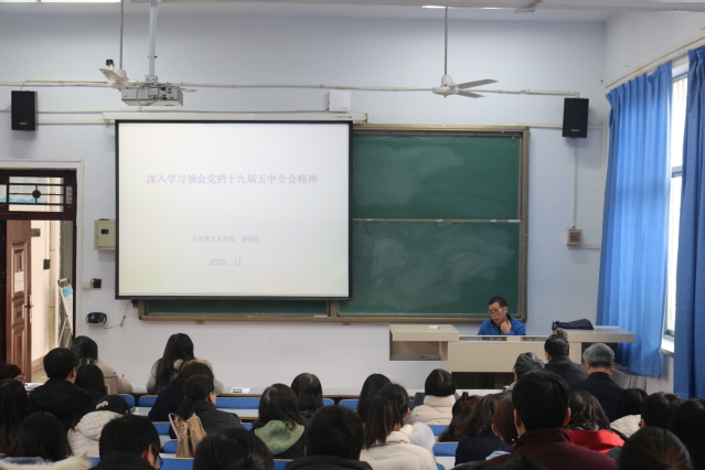 为全面深入学习领会党的十九届五中全会精神,11月26日,外国语学院在东二楼100室举办党的十九届五中全会精神宣讲会。会议邀请学校党委讲师团成员、马克思主义学院副教授郭晓先同志作专题报告,报告会由我院党委书记王伟主持,全体教职工及学生党员代表参加会议。