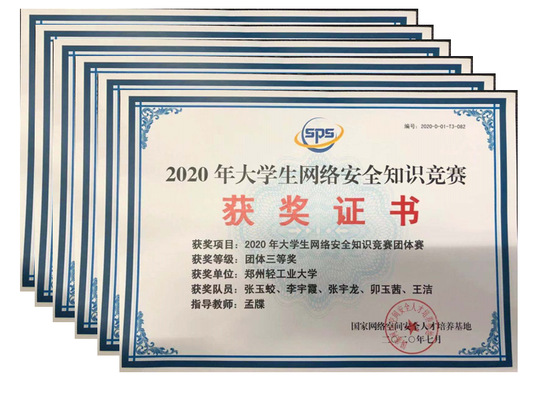 此次比赛主要考察选手对《网络安全法》及相关政策法规、网络安全基础知识、个人信息保护、网络安全防护技能等内容的掌握情况。共分为两个阶段,第一阶段为资格赛,主要考察学生的信息安全意识水平,第二阶段为全国总决赛,主要考察学生的网络安全基础知识和基本技能。我院同学在资格赛中表现优异,共有59名同学进入决赛,最终凭借丰富的积累,扎实的基础,张玉蛟以全国排名23名的好成绩,带领学院10名同学,组建两支队伍获得2020年大学生网络安全知识竞赛团体赛三等奖。本届大赛获奖的学生个人,根据奖项级别将获得由中国信息安全测评中心颁发的网络安全人员资质证书。