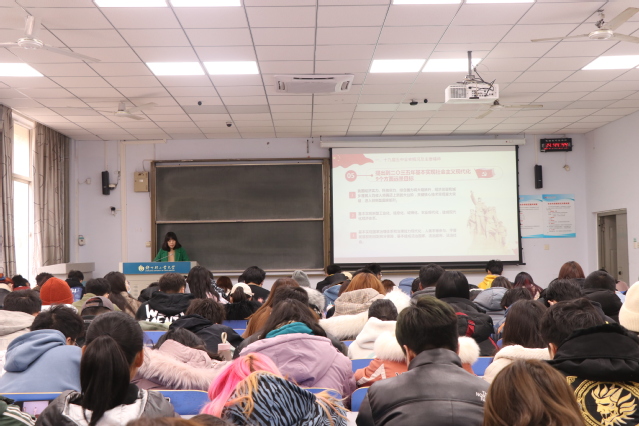为深入学习贯彻党的十九届五中全会精神,2020年12月3日下午,艺术设计学院在教三楼108开展了“党的十九届五中全会精神” 专题学习活动。本次活动特别邀请外国语学院团委书记矫菲老师主讲,学院团学骨干以及青马培训班成员共150余人参加了此次活动。