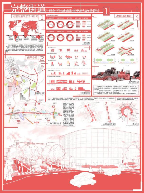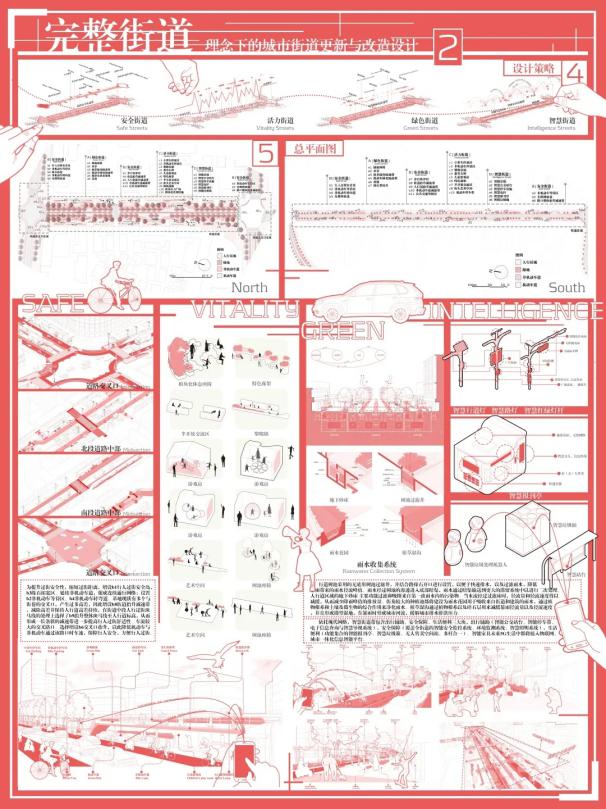 本次获奖作品包含了城市街道更新的问题,并引入完整街道的概念。从“以车为本”转为“以人优先”的理念,结合安全、活力、绿色和智慧街道四个基本策略展开设计,具有一定的探讨价值。作品完整、深入的研究了街道更新的诸多焦点问题,并设想了完善的解决方案,集约化的构建了街道生活空间,对于国内同类城市交通空间的更新改造项目有一定的借鉴意义。