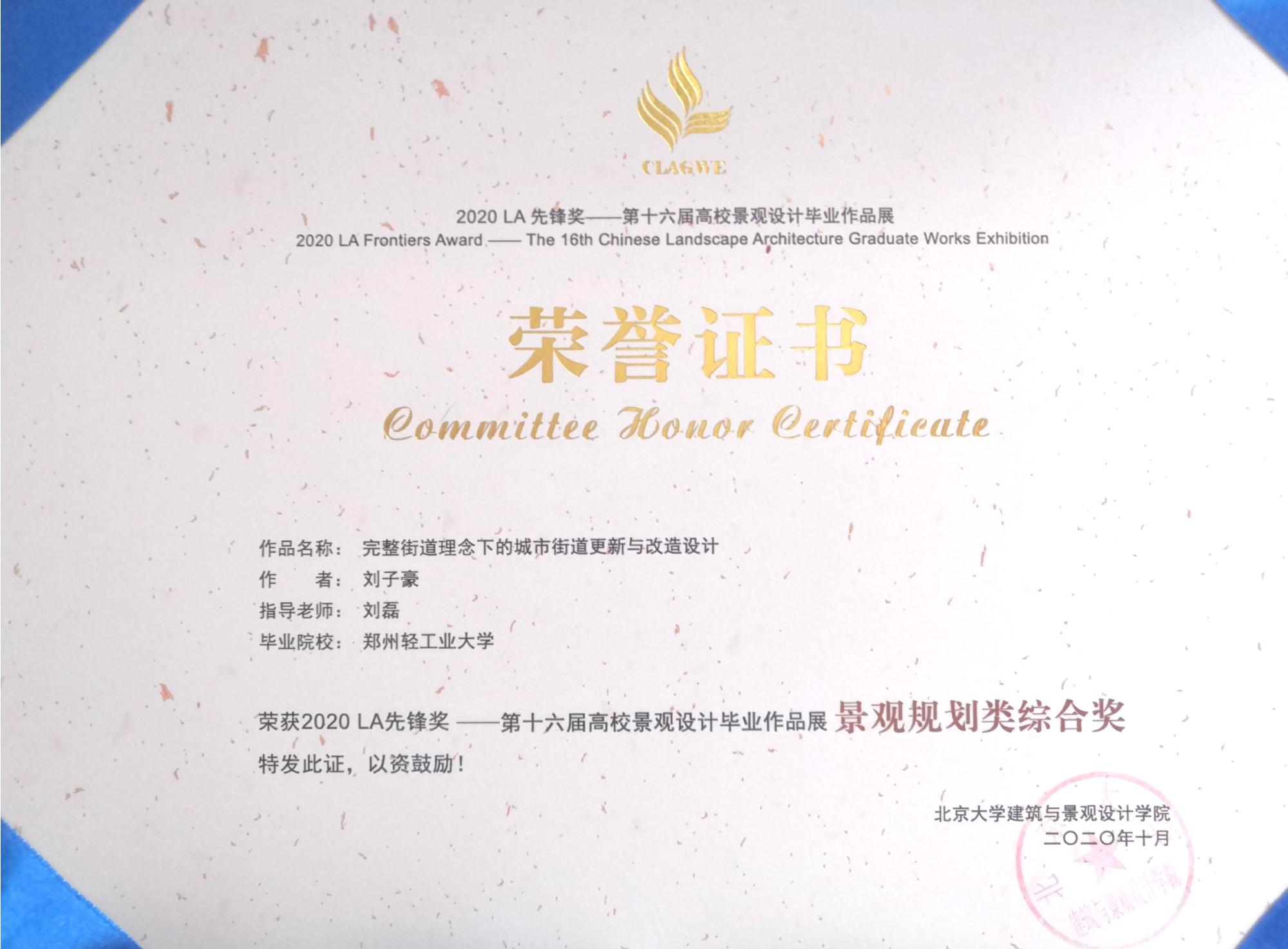 2020年12月12日由中国城市科学研究会景观学与美丽中国建设专业委员会主办的“第十六届LA先锋奖——高校景观设计毕业作品展”在深圳市举行颁奖仪式。我院刘磊老师指导的2016级环境设计专业学生刘子豪的“完整街道理念下的城市街道更新与改造设计”,在此次比赛中,以作品排名第一、全网在线答辩排名第二的优异成绩获得综合奖(景观规划)第1名,并作为获奖代表登台领奖。