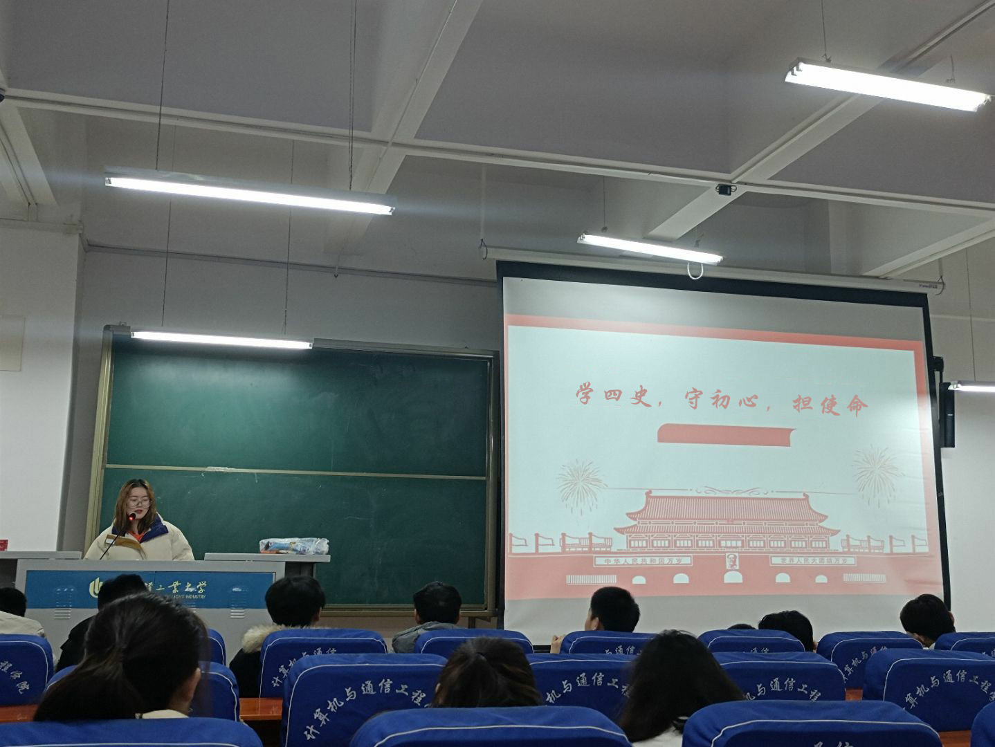 为进一步引导广大青年团员弘扬以爱国主义为核心的民族精神,牢记总书记的殷切嘱托,体现新时代青年健康向上,担当作为的精神风貌,充实理论学习教育,计算机与通信工程学院(电子信息工程学院)于2020年12月10日在计算机楼217组织开展以“学‘四史’守初心 担使命”为主题的团课活动,18、19级学生代表参加了此次活动。