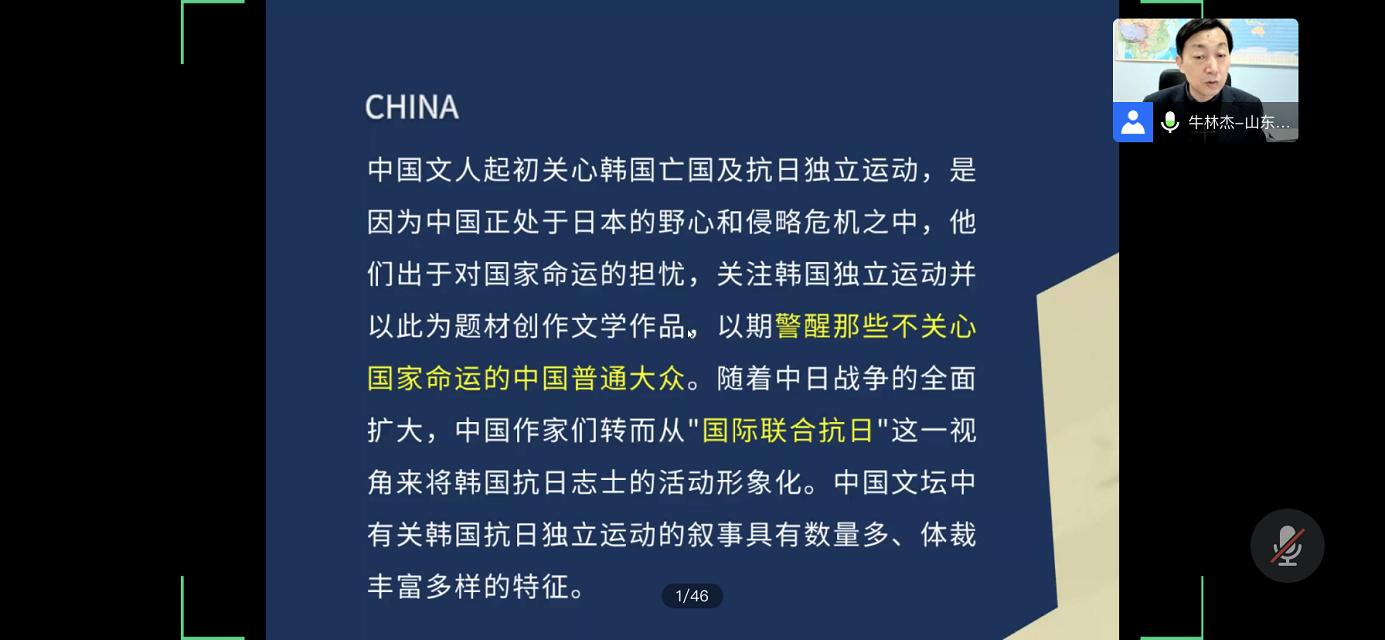 讲座中,牛林杰教授就20世纪初韩国独立运动志士纷纷流亡中国、俄罗斯、美国等国家并在海外继续进行抗日独立事业进行了简要叙述,讲述了韩国独立运动过程中涌现出的安重根、尹奉吉、金山、李范奭、金若山等抗日英雄及其事迹。同时,牛教授指出,这些事迹在许多东亚国家文学作品中得到了反映,但中国、美国和日本作家们的韩国抗日志士叙事呈现出了不同的形态和特征。