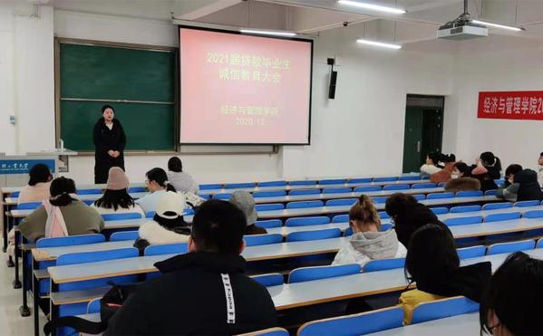 为帮助贷款毕业生了解掌握还款流程和注意事项,加强贷款毕业生诚信教育,12月29日,经济与管理学院在经管楼309召开2021届贷款毕业生线上诚信教育大会,负责学院资助工作的李育光老师和贷款毕业生参加此次大会。