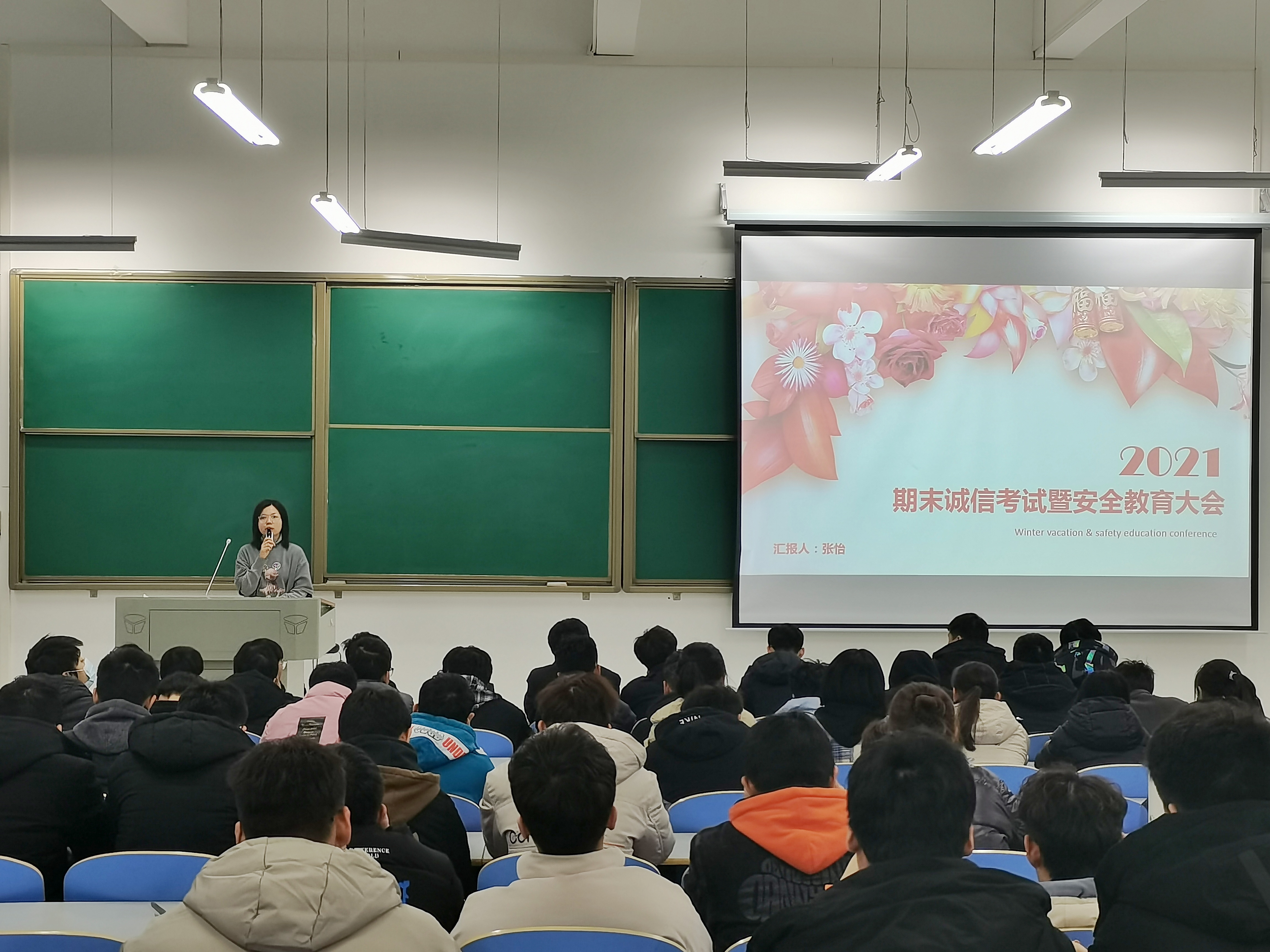 各年级辅导员向同学们强调了诚信考试的重要性以及考场违纪的严重后果,面对即将迎来的期末考试,希望全体学生严守考场纪律,认真复习,诚信考试,拒绝作弊。围绕宿舍安全、财产安全、心理安全、防疫安全,辅导员们为大家讲述了各项假期安全防范注意事项,希望同学们在校、离校期间都能够自觉遵守纪律,认真配合各级防疫要求和学院管理制度,提高警惕,增强自我保护意识,减少跨地区流动,做好行程信息及健康状况日报告,科学有效的做好疫情防控工作。