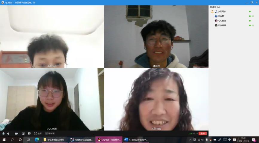小组成员采用视频会议的方式分别与学院建档立卡的同学及其家长进行了沟通。通过视频我们可以大致看到同学的生活环境,对困难同学的家庭情况有进一步了解。小组成员先向困难同学及家长线上讲解了补助政策以及关于建档立卡的补助内容,然后详细介绍了助学贷款政策,并对家长的疑问进行了耐心解答。困难同学及其家长均表示国家补助政策对家庭提供了很大的帮助,分担了经济上压力。家长们对学校的关怀与帮扶表示感谢,同时,表示一定会配合学校,教育孩子自强不息、立志成才、报效国家和社会。参与活动的成员们也都感受到了国家资助政策的温暖以及贫困家庭对资助政策的感激。