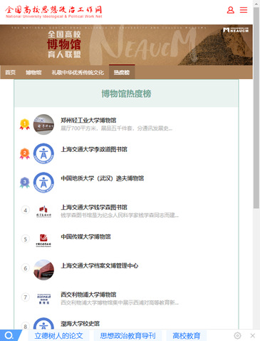 为充分发挥高校博物馆育人作用,全国高校博物馆联盟基于全国高校思想政治工作网 “育人号”平台建立了“博物馆育人联盟”展示平台,展现我国高校在建党100周年特别是党的十八大以来的光辉历程中所发挥的重要作用和重要成就。我校电子科技博物馆已成为育人的重要阵地,开展了丰富多彩的育人活动,在涵养校园育人文化方面发挥了重要作用,近日荣登全国高校博物馆育人联盟热度榜首。