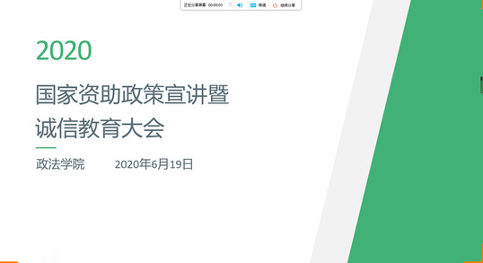 为进一步落实国家资助政策宣传“两节课”工作,做好疫情期间的学生资助工作,不断加强学生诚信教育,政法学院于6月19日上午在线上召开了2020年国家助学贷款政策宣讲暨诚信教育大会,学生资助工作专职辅导员栗想老师和各年级学生代表参加了本次会议。