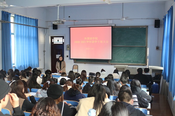 2021311日,外国语学院在教一楼100召开新学期全体团学干部大会,外国语学院党委副书记马宇、学生会全体成员及各年级团干参加会议。会议由外国语学院团委书记矫菲主持。