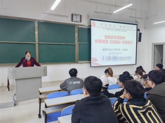 为深入贯彻习近平总书记在党史学习教育动员大会、全国脱贫攻坚总结表彰大会的重要讲话精神,落实学校《关于开展“2021年春季开学思想政治教育第一课”的通知》安排,3月23日中午,在工程楼109室,能源与动力工程学院党委书记邵建敏以“扬脱贫攻坚精神,树爱国情、立强国志、践报国行”为题上了一次爱国主义思想政治教育课。学院全体专职辅导员,本科生、研究生全体党员和学生代表200余人参加了此次学习。