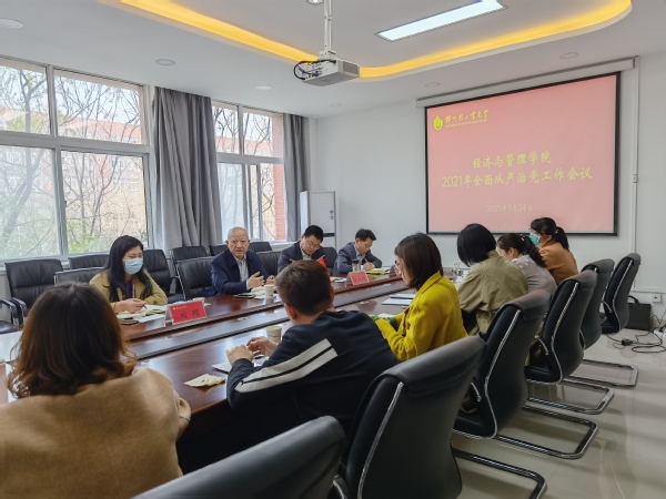 为贯彻落实学校会议精神,推进全面从严治党工作,3月24日下午,经济与管理学院党委在经管楼219会议室召开2021年全面从严治党工作会议,学习传达学校全面从严治党会议精神,安排部署学院全面从严治党工作。校纪委书记张晓根出席会议并与干部进行了集体廉政谈话,院党委委员、各党支部书记、科级干部参加了会议,会议由院长刘珂主持。