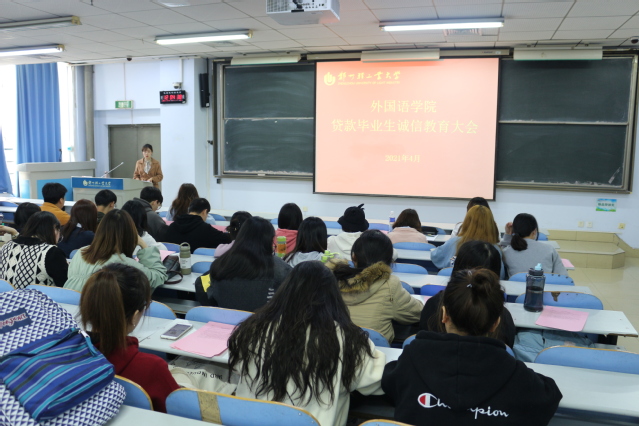 为进一步强化助学贷款学生诚信教育,完善国家助学贷款工作流程,提高学生还款意识、诚信意识和安全借贷意识,外国语学院于4月19日中午在教三楼104召开2021届贷款毕业生诚信教育大会。辅导员张文卿老师、全体贷款毕业生参加了会议。