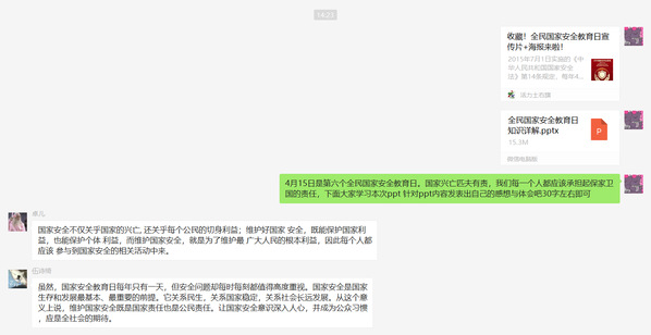 我院各团支部通过线上ppt学习、线上讨论、线上观看视频等多种形式,引导青年团员提高国家安全意识,提升维护国家安全的自觉性和主动性。通过《国家安全教育课》《如何应对诈骗电话》《青少年如何抵御邪教诱骗》等视频了解了国家安全的基本知识和影响因素以及总体国家安全观的内涵,使大家及时认识到了当前国家安全形势等相关知识,引导同学们正确维护国家安全。