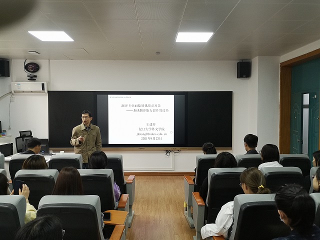 4月23日上午,应外国语学院邀请,复旦大学外文学院博士生导师王建开教授在东二楼209做了题为“翻译专业(MTI)面临的挑战及对策——兼谈翻译能力提升的途径”学术报告。报告由翻译硕士(MTI)专业学位办公室主任赵祥云博士主持,硕士研究生导师和全体研究生以及部分本科生参加了此次讲座。