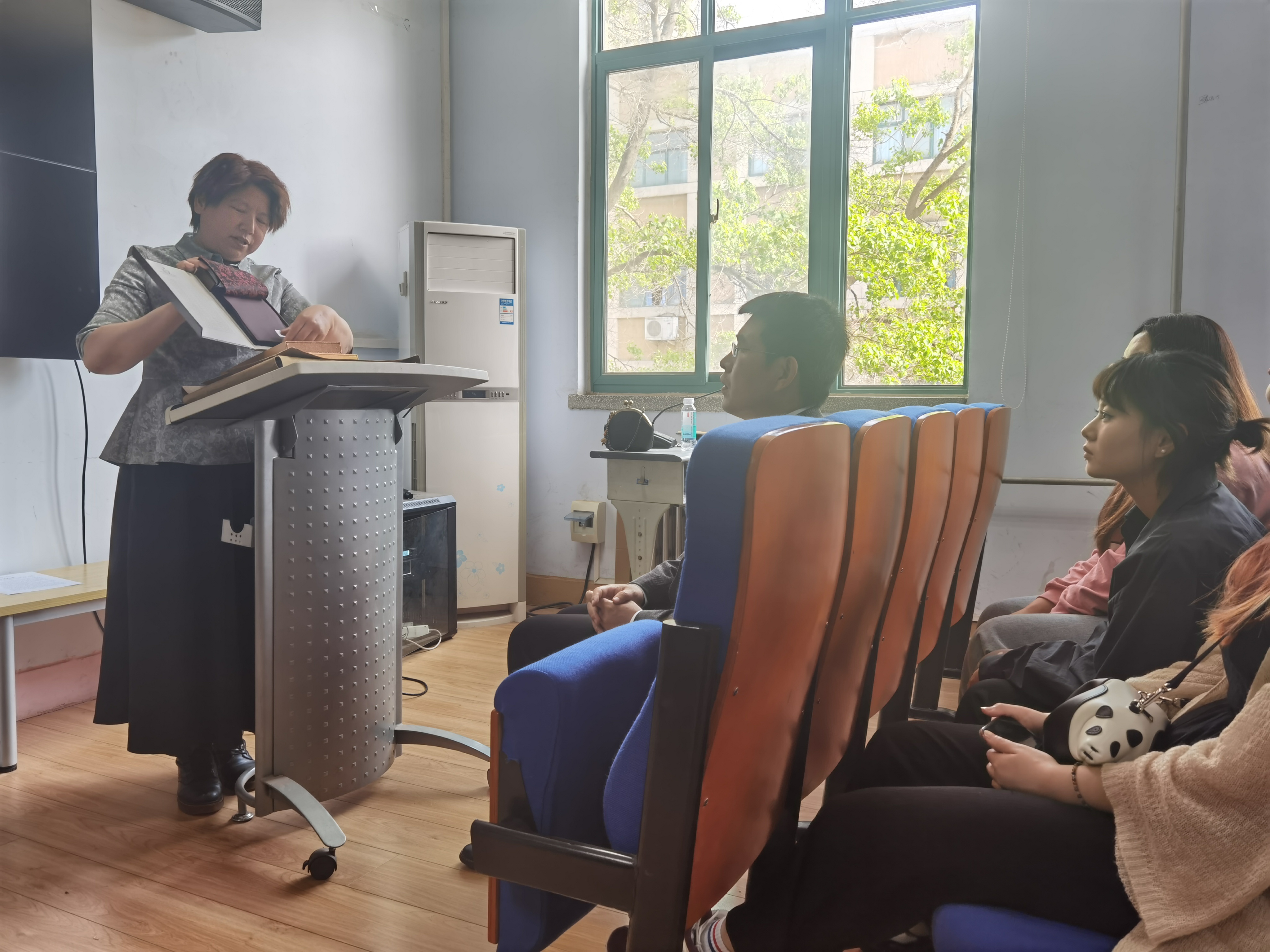 王瑞雪老师首先从国际顶尖面料的产地、发展、设计、艺术价值等方面展开详细地讲解。并结合个人的游学经历,对意大利纺织服装面料的艺术性、科学性、时尚性等方面与同学们进行分享;其次,王老师现场展示了个人原创的最新“丝毛织锦”面料的设计作品,详细介绍了其研发过程,同学们可以直观触摸,感受顶级面料的艺术魅力;最后,王老师结合个人的设计生涯,勉励同学们努力学好设计。设计师是企业的灵魂,中国企业更需要具有国际眼光又掌握传统文化的设计师。