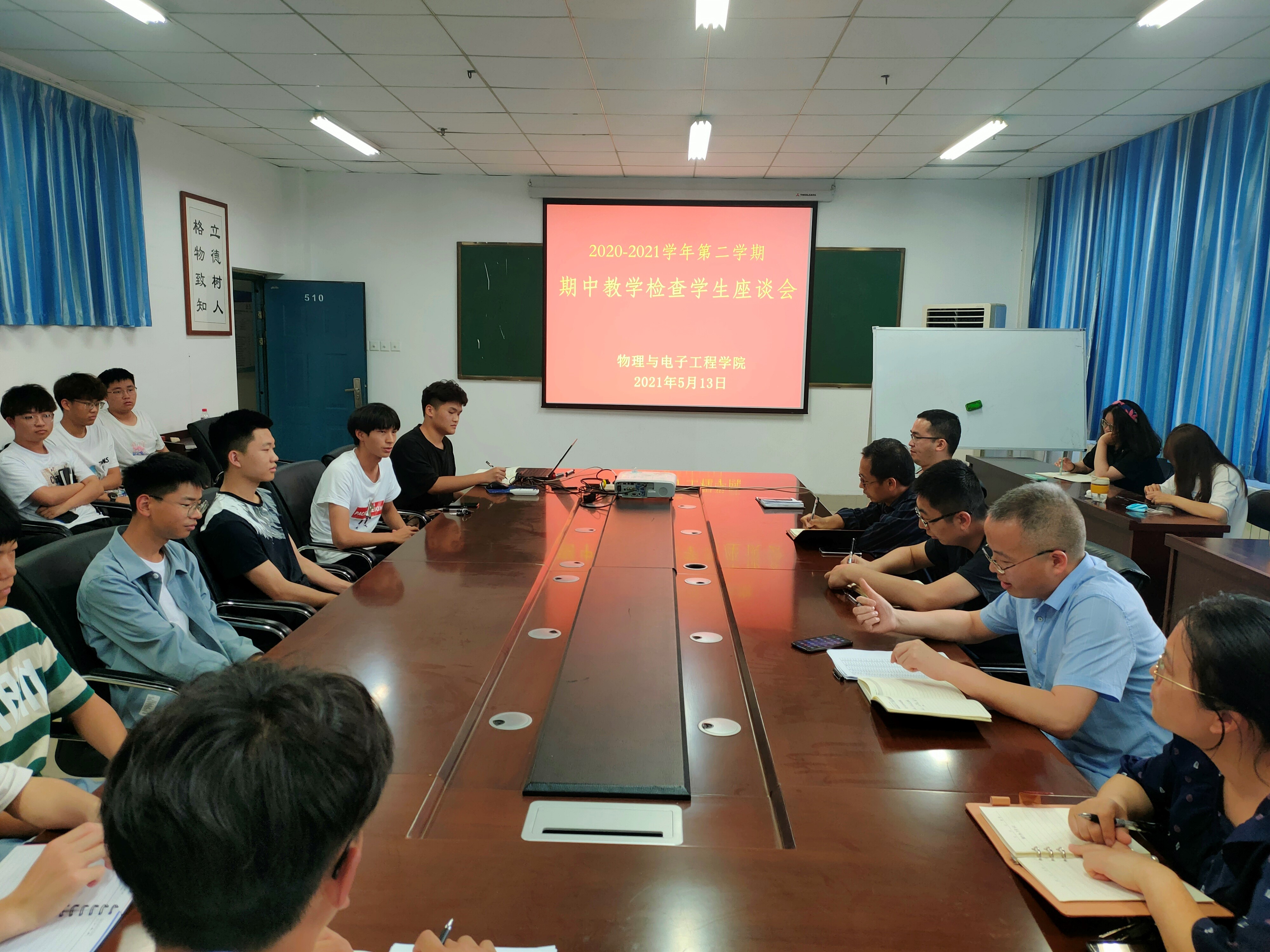 为充分了解教学过程中的实际情况,加强教学信息反馈,提升教学质量,物理与电子工程学院于5月13日下午,在四教楼510召开了期中教学检查学生座谈会,系(部)主任、教师代表及各年级学生代表参加了座谈会。座谈会由副院长冯学超主持。